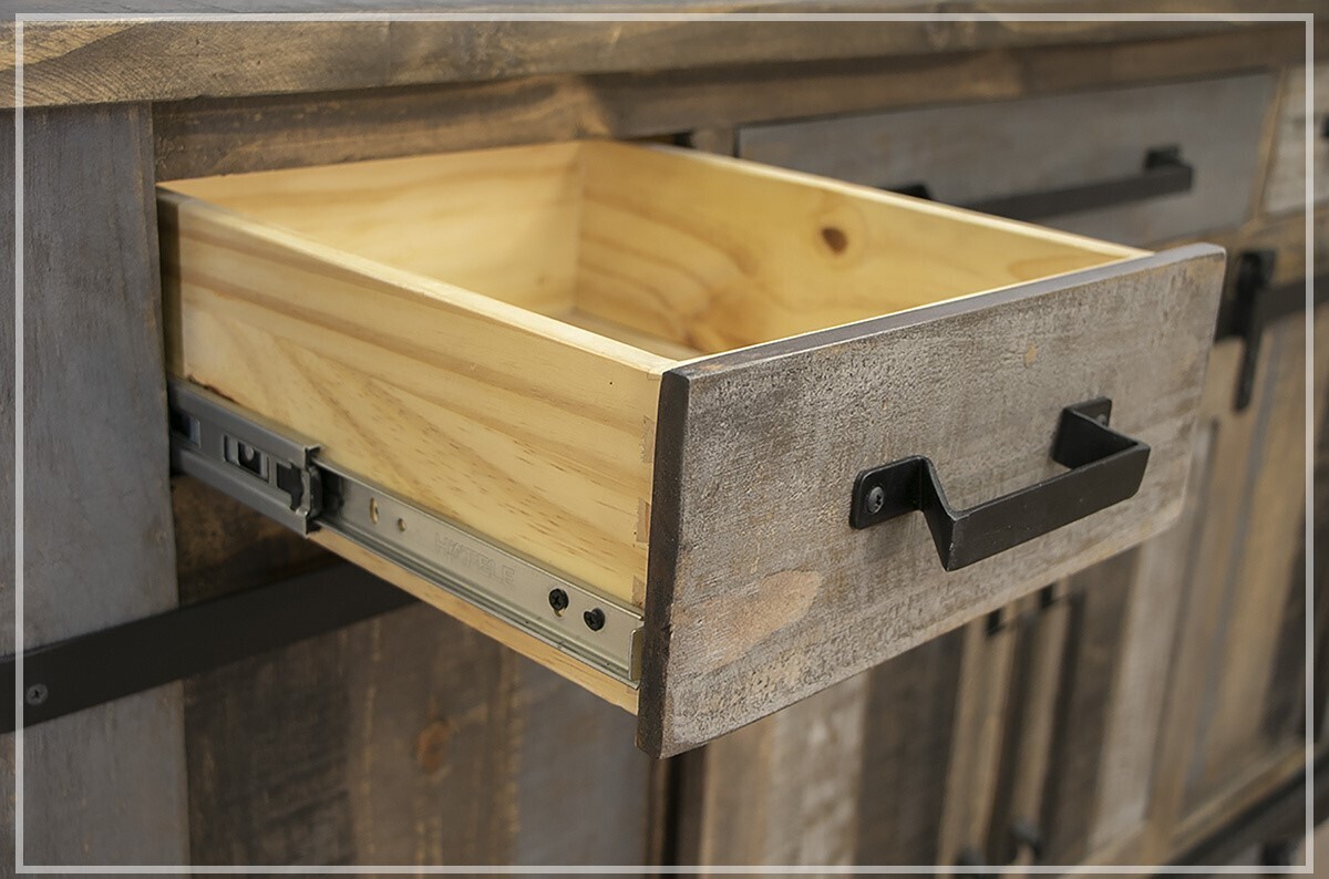• Features three deep drawers, two sliding doors that reveal storage with a fixed shelf and two extra storage compartments behind metal mesh doors on sides.